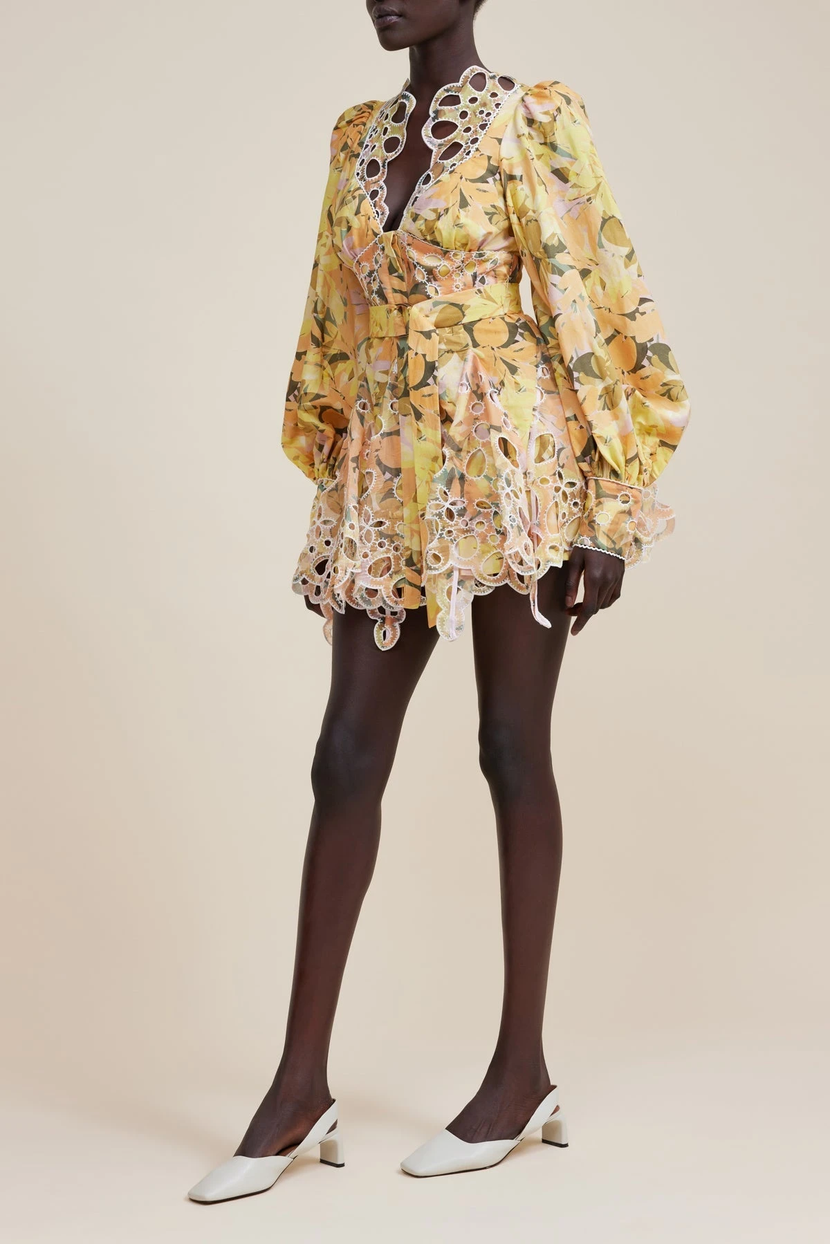 The Arnoult Dress in Kaleidoscope Floral by Acler is perfect for your events this season. Laser cut out detail, with white lace binding feature at the neck & hemline, adjustable waist belt with luxe gold hardware and accentuated sleeves.