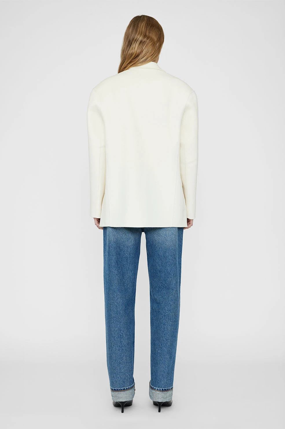 Made in the same fabrication as the best-selling and adroed Dylan Coat, the Quinn Blazer by Anine Bing in white is crafted in an unlined, wool-cashmere blend equipped with traditional tailored details like a notched collar, three front pockets, and a two-button closure at its center front. Finished with removable shoulder pads. The perfect topper, layer over a simple tee with light wash denim and loafers.Β