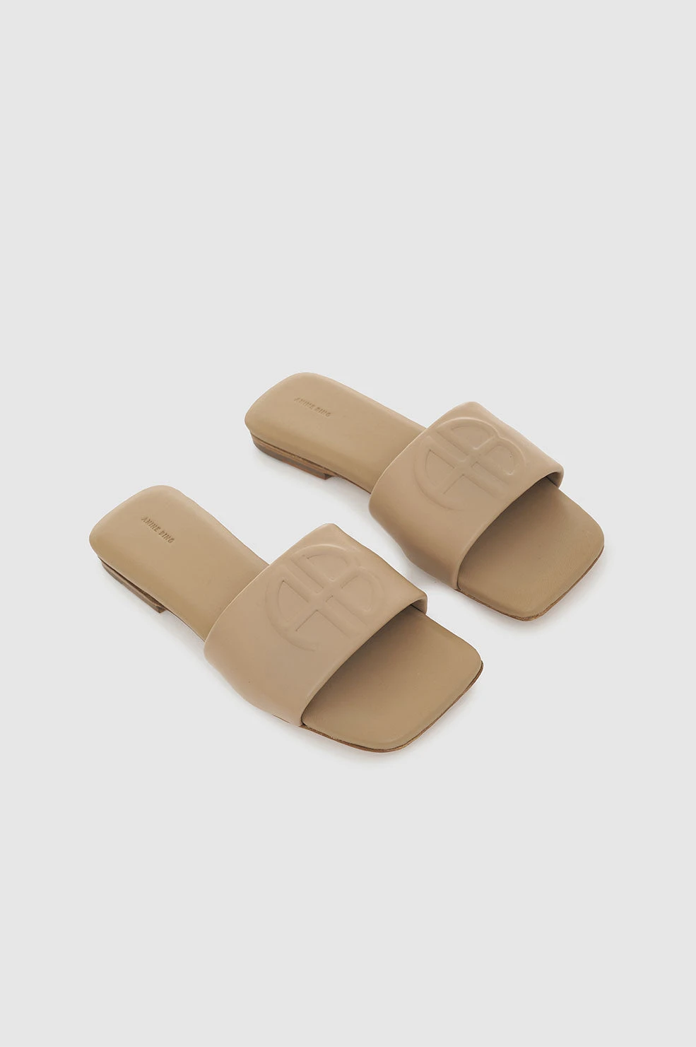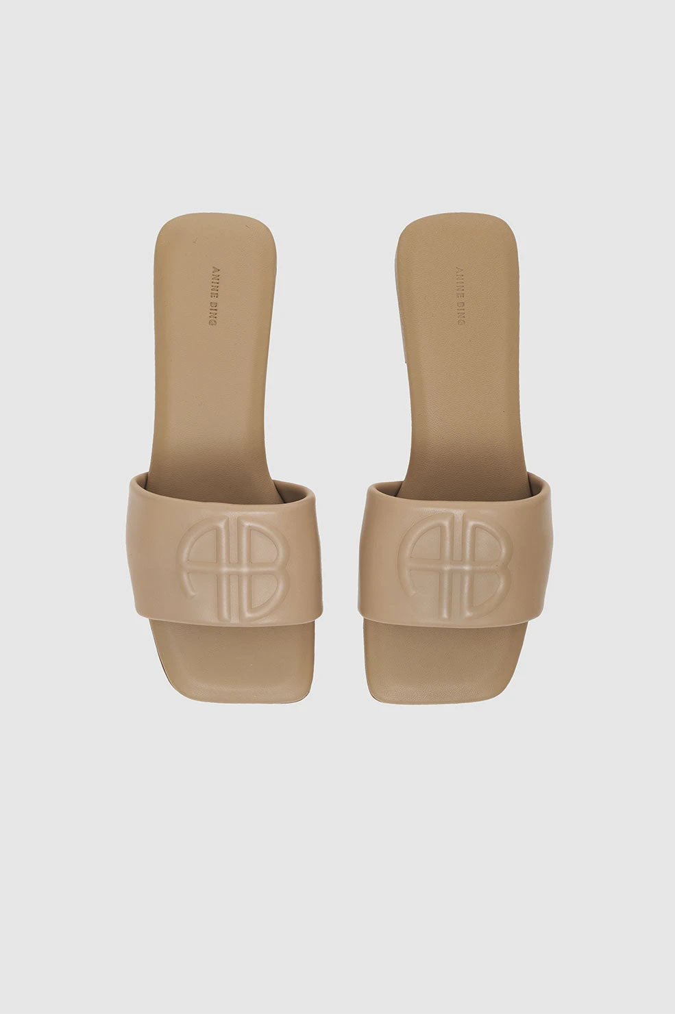 The Anine Bing Ria Slides in Butterscotch Monogram will effortlessly elevate your outfit.Β Carefully craftedΒ from smooth 100% lamb leather with a cushioned insole to keep you comfortable all day long. This style’s seamless construction features a puffy embossed Anine Bing monogram.