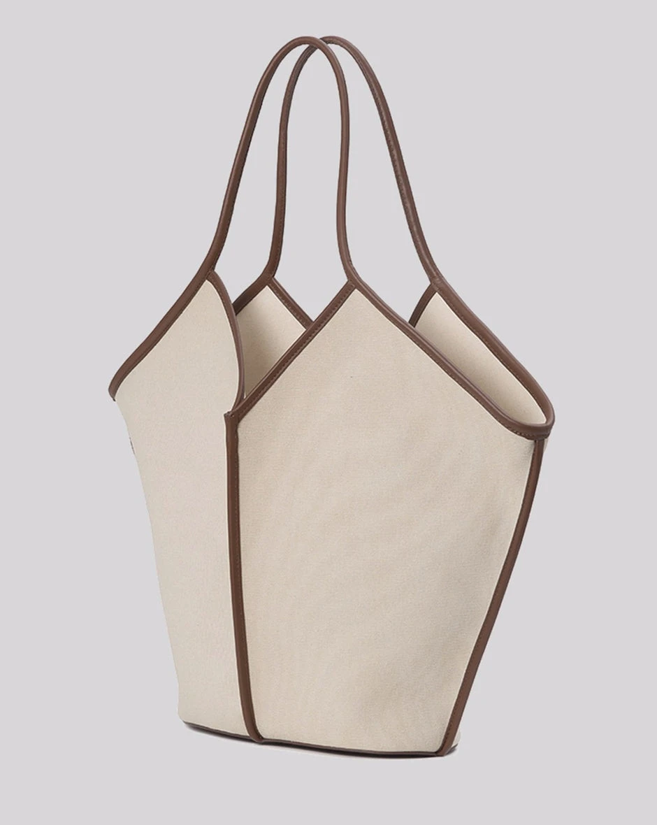 The Hereu Calella Tote Bag in Beige/Chestnut. An Organic cotton tote bag edged with smooth leather. It has a zipped pouch to secure small essentials and slim top handles that sit over the shoulder.Β