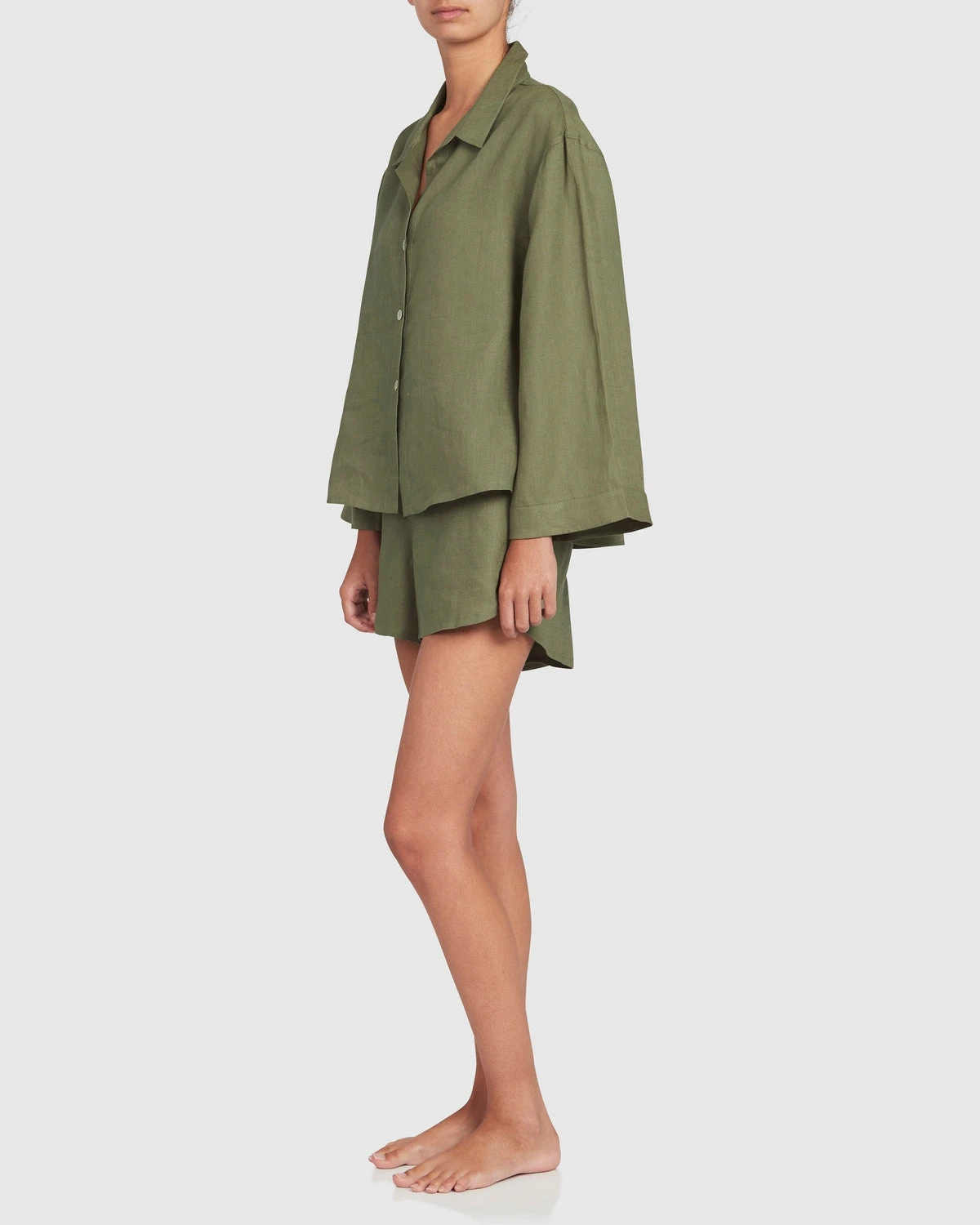 The Jasmine And Will Anjuna Linen Set in Olive. A relaxed style for at home or out and about cut from French stonewashed linen that’s EUROPEAN FLAX® certified organic. Perfect worn as a set or as separates. The shorts feature a mid-to-high waist with drawcord, deep pockets and a scalloped shape hem to slim and flatter the leg. The top is cut for a relaxed floaty fit. A chic and versatile addition to your loungewear wardrobe.