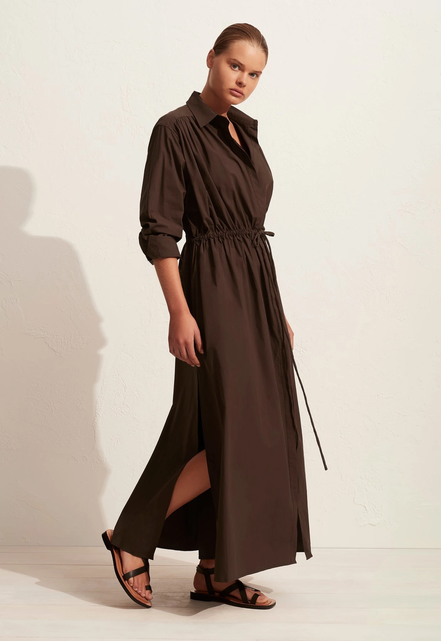 The Matteau Drawcord Shirt Dress in Carob. A relaxed button front shirt dress with drawcord tie at the front waist. Gathered front shoulder. Side splits and pockets. Tumbled 100% Organic Cotton. Made in Australia.