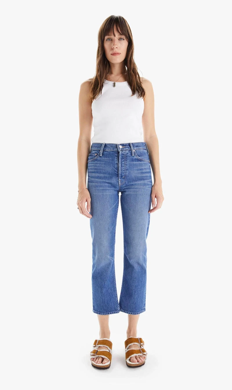 The Mother Denim Tomcat in runnign with Scissors. Thrill seeker.Β The bestselling high-rise straight leg with a button fly, cropped inseam and clean hem. Crafted from semi-rigid SUPERIOR denim, Running With Scissors is a classic mid-blue wash with whiskering and fading for a lived-in look. MOTHER does the work for you.