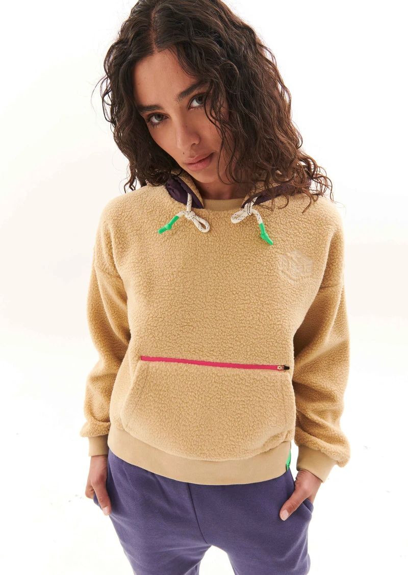 The Maximise Hoodie in Beige by PE Nation comes as part of the brand’s latest Ready, Set, Letβs Go Collection, designed to inspire sky high energy, the pursuit of all passions, an appreciation for the power of now and the endless possibilities hidden within present time. A relaxed fit teddy sherpa fleece hoodie with wide fit hem and classic kangaroo pouch pocket at front, the Maximise Hoodie is an elevated off-duty piece to add to recovery day co-ords. Contrast spray fabrication in purple pennant gives point of difference at back, with a functional drawcord featuring reflective detailing and fluro silicon dipped ends. Waterproof zip pocket at front features pink glo fluro covering and gold-plated hardware. Embroidered P.E Nation cube print sits at chest.Β