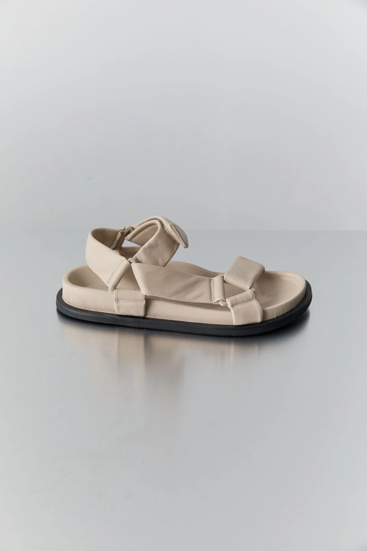The St. Agni Padded Sportsu Sandal in Ecru is an all-time favourite with a seasonal update.Β Boasting a thick rubber sole, moulded footbed, round toe design, and buttery soft lambskin velcro straps and triangular hardware, the Padded Sportsu Sandal combines the utility and ease of sportswear with the timelessness and minimalism of capsule styling.Β