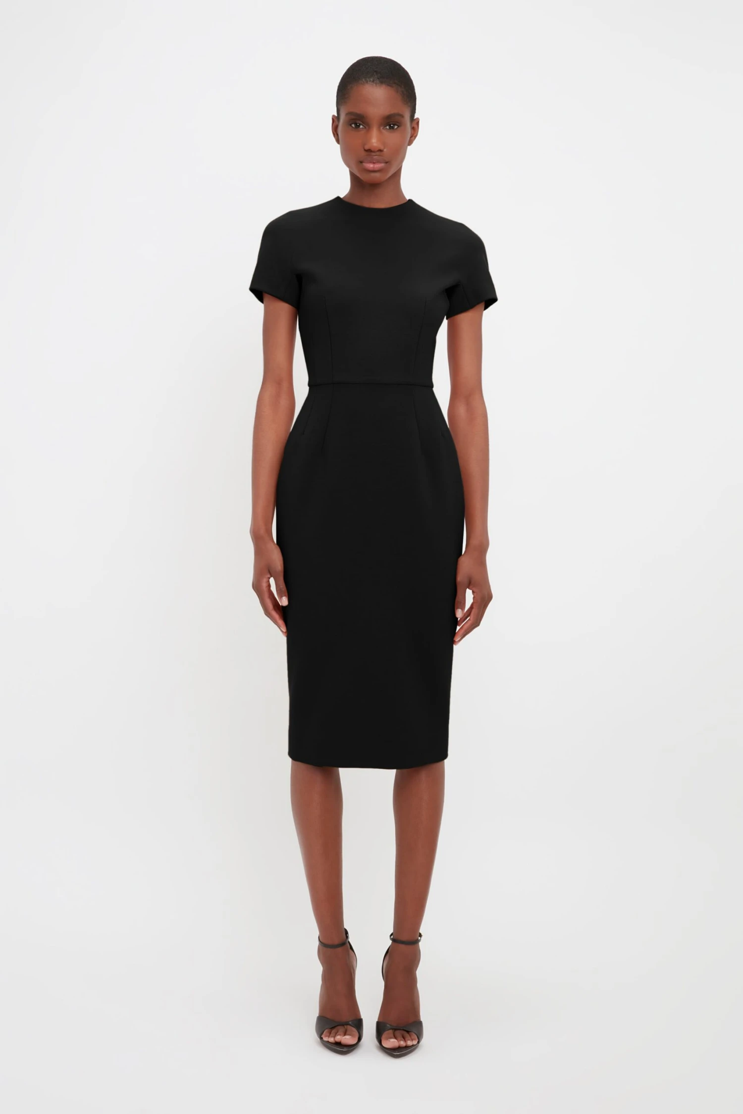 A Victoria Beckham signature, the T-Shirt Fitted Dress is inspired by the simplicity of a T-shirt but with an elegant twist. This dress brings a fresh approach to one of the brand’s signature fitted shapes and is crafted from a luxurious matte, bonded crepe fabric that offers a narrow, flattering fit, while a high neck and midi hemline create an elongated silhouette.