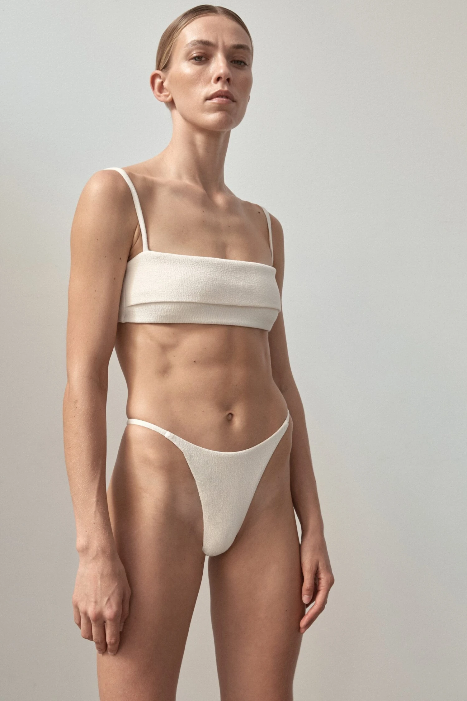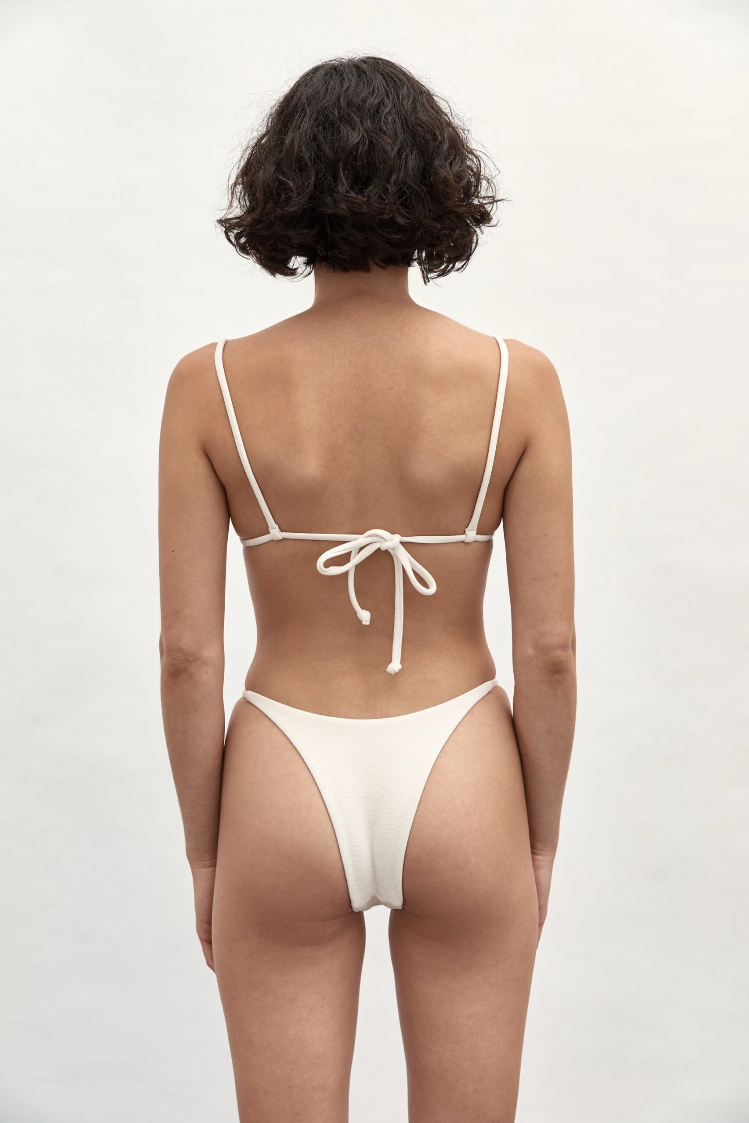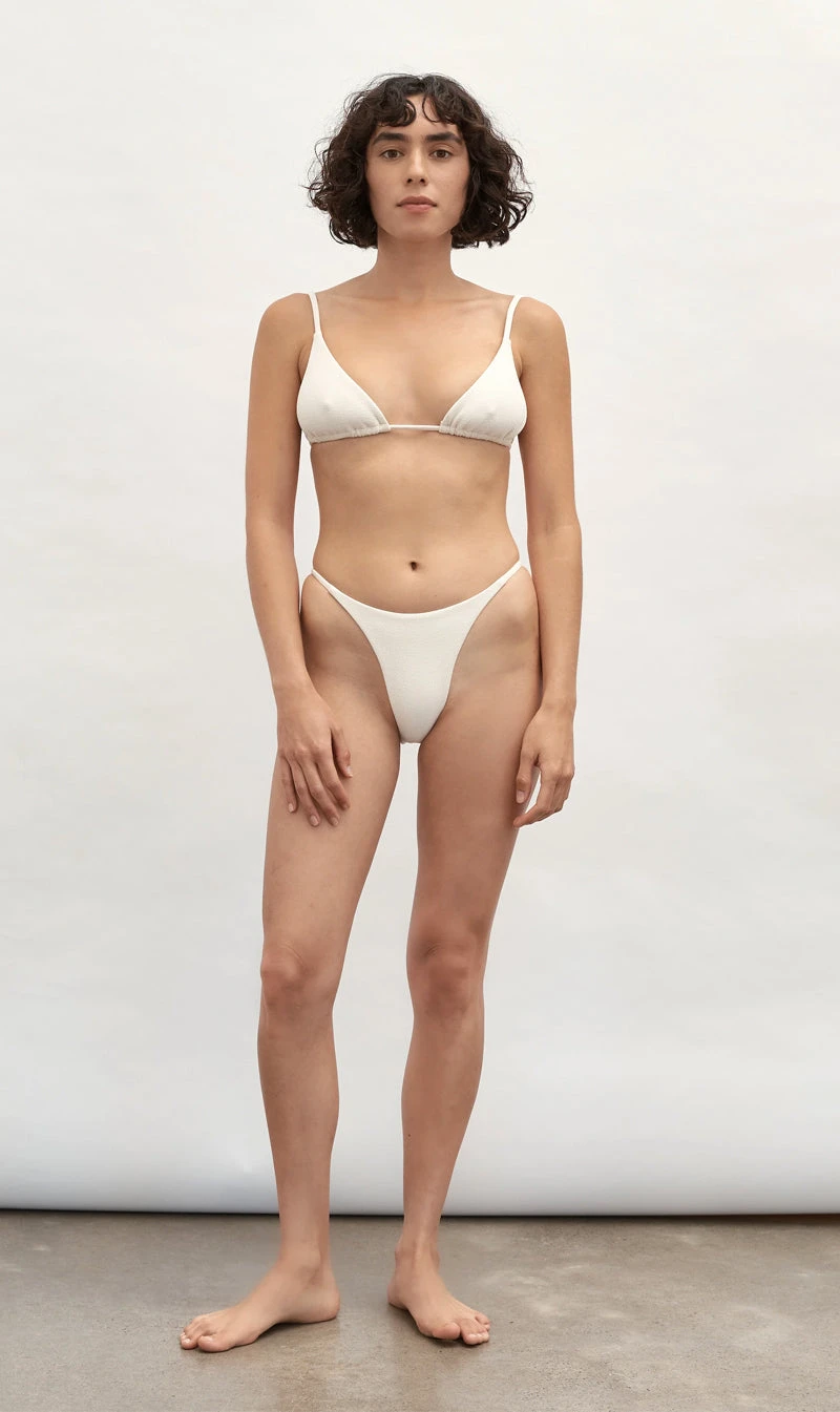 Taking cues from the barely-there silhouettes of Brazilian swimwear, the Ziah Rio Bottom in Ecru boasts a clean, sharp cut to accentuate the leg-line. Featuring a cheeky cut and spaghetti straps, the Rio Bottom has been crafted from signature biodegradable boucle fabric with a regenerated polyamide lining for a comfortable, elevated design that stays put in and around the water.